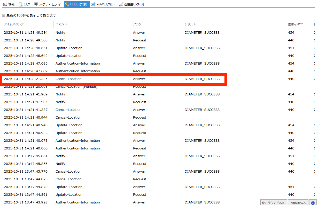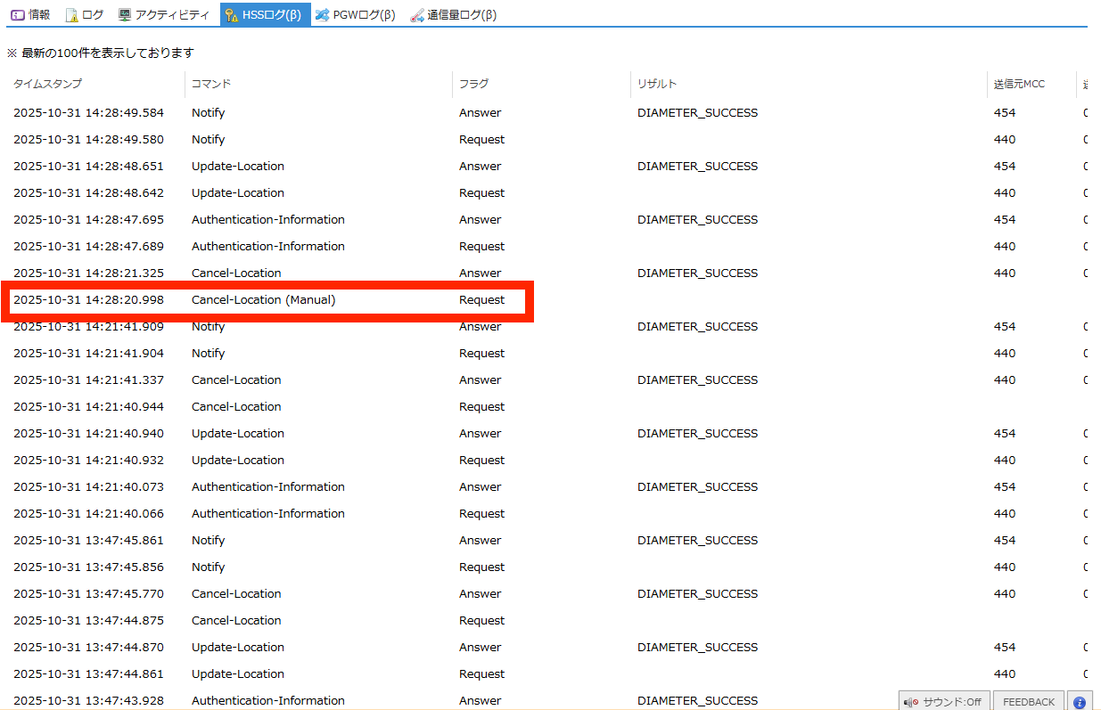HSSログに Cancel Location Request (Manual) のログが表示されます。
