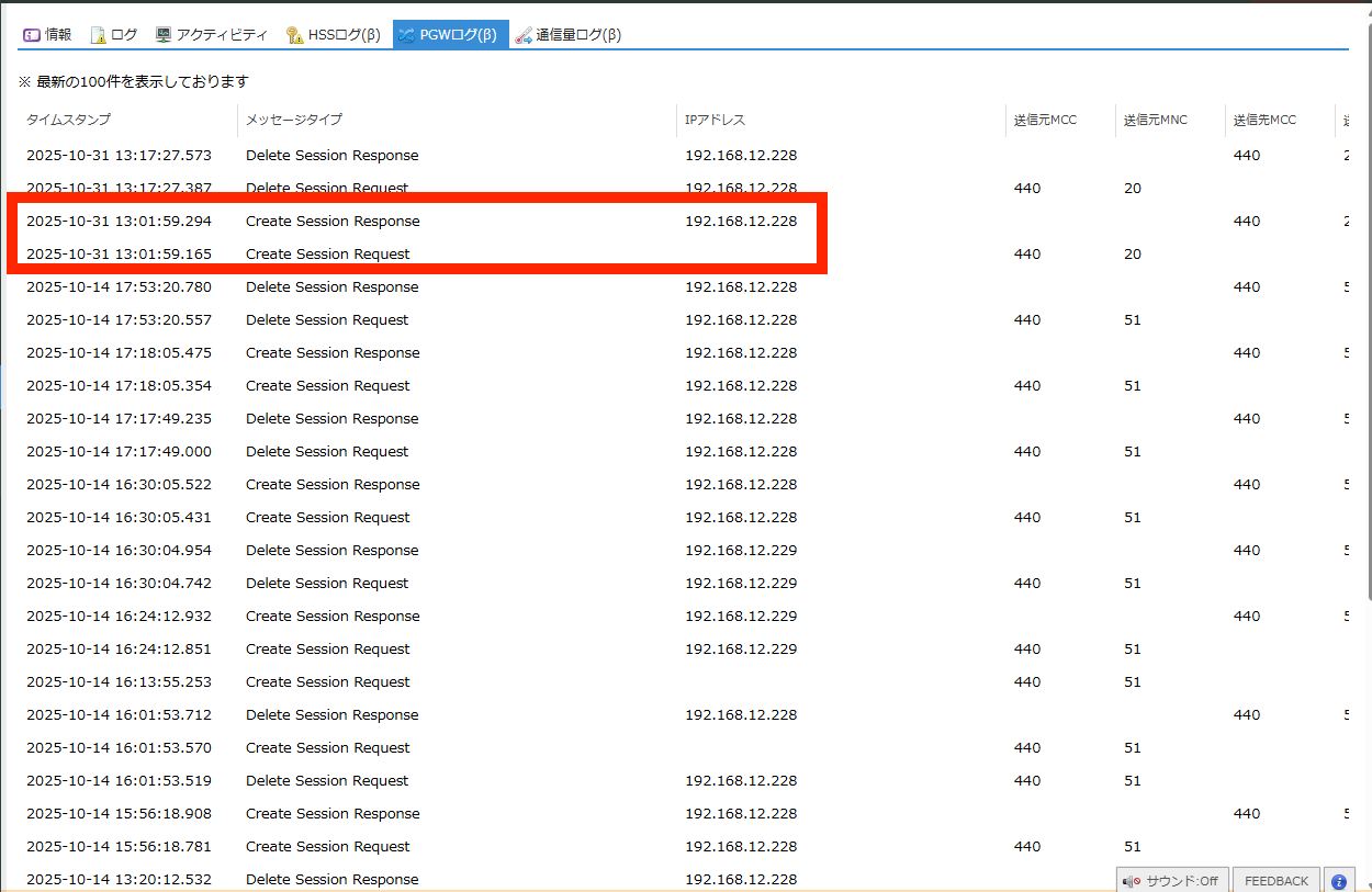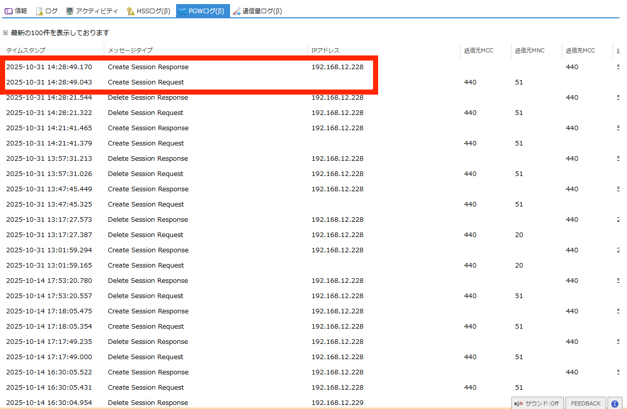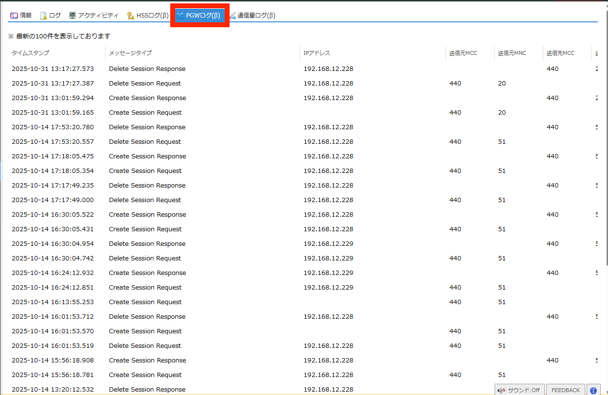 SIMのセッション確立に関するのPGW(PDN GateWay) のログが閲覧できます。 |