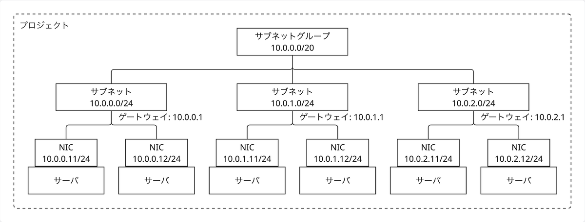 また、サブネットグループ・サブネット共にCIDR形式で表現されるIPアドレス範囲を持ちます。各サブネットのIPアドレス範囲は、上位サブネットグループのIPアドレス範囲内から互いに重複しないよう割り当てます。