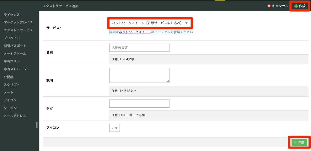 右上の「追加」ボタンをクリックし、サービスの中から「ネットワークスイート」を選択し、お申し込みください。