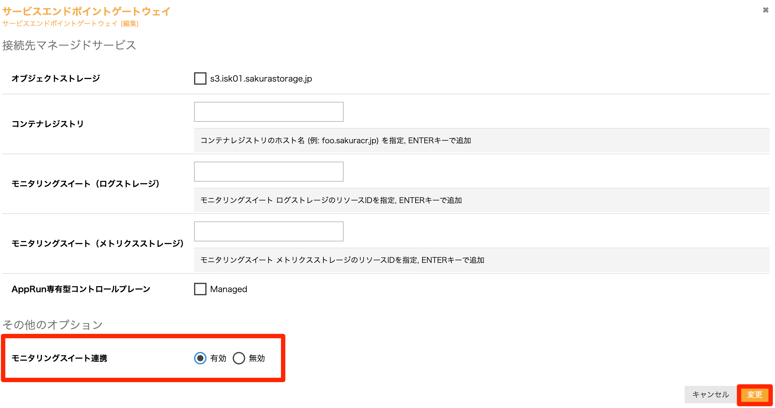 「モニタリングスイート連携」で「有効」を選択し、「変更」をクリックします。