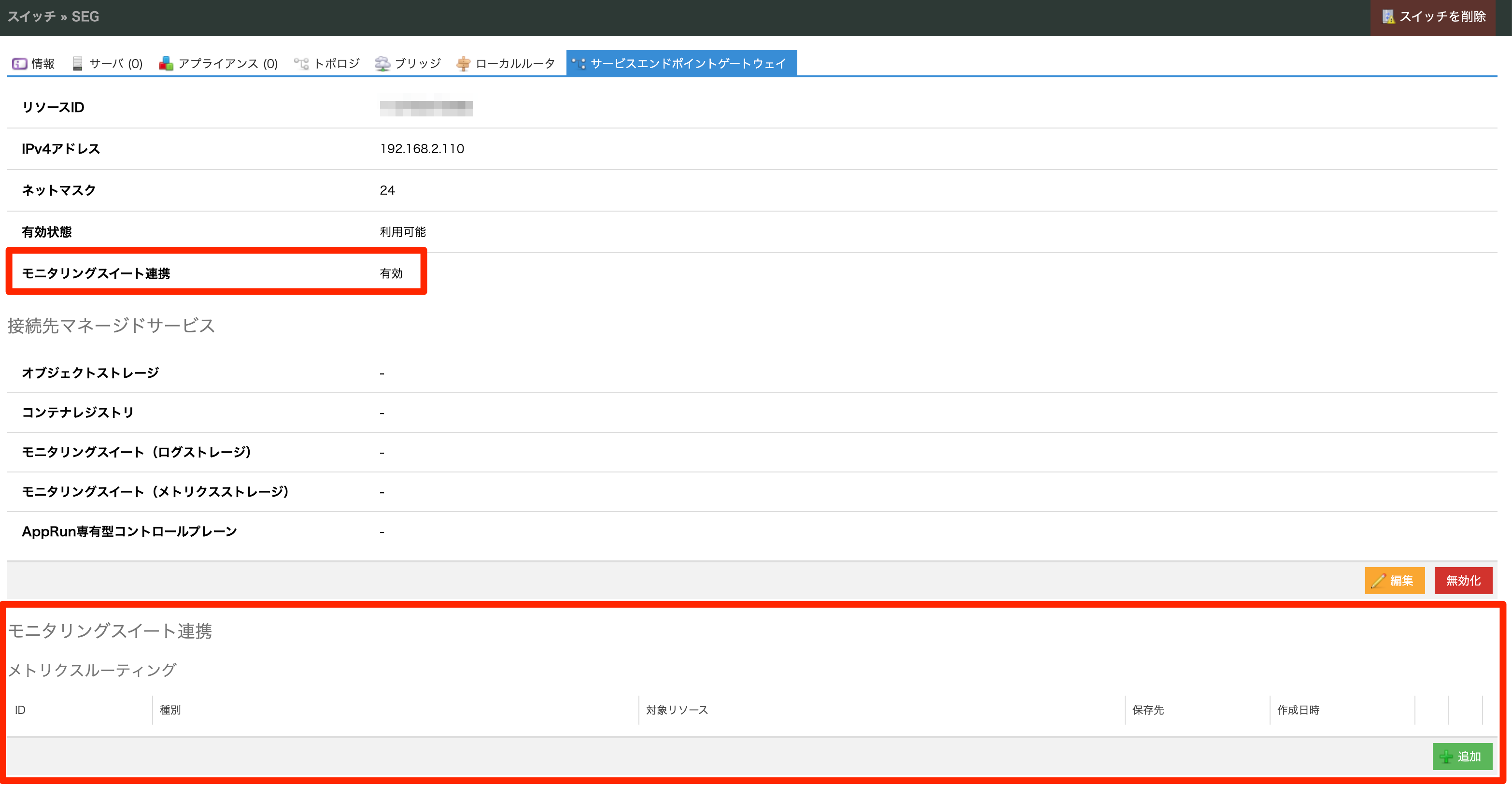 「モニタリングスイート連携」が「有効」になっていることを確認します。また、メトリクスルーティングの一覧・追加ボタンが表示されていることを確認します。