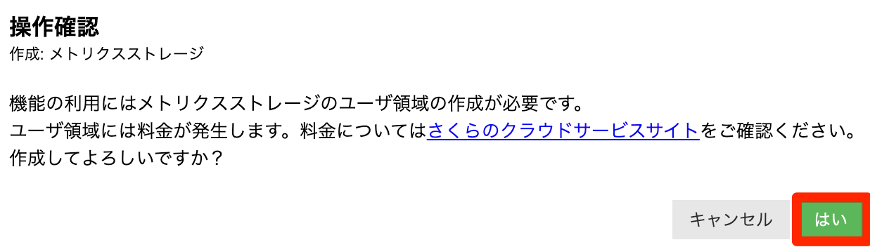 メトリクスストレージのユーザ領域が作成されていない場合、確認ダイアログが表示されるため、「はい」をクリックします。