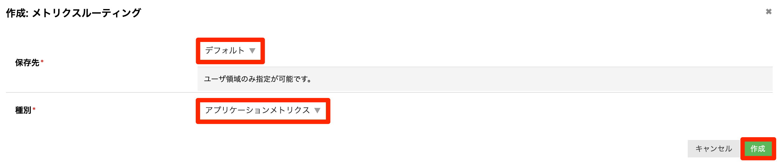 保存先のメトリクスストレージと、種別「アプリケーションメトリクス」を選択し、「作成」をクリックします。