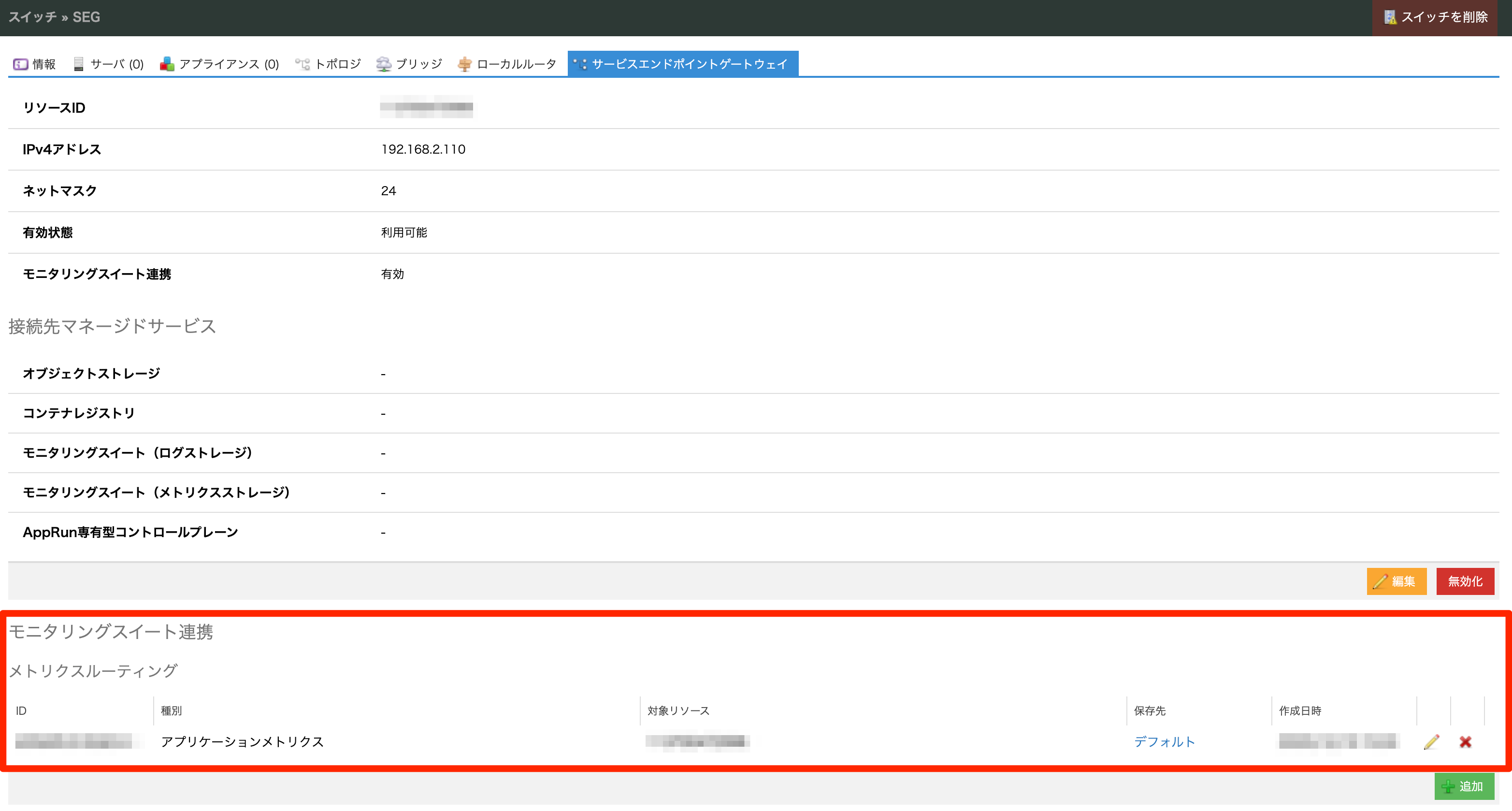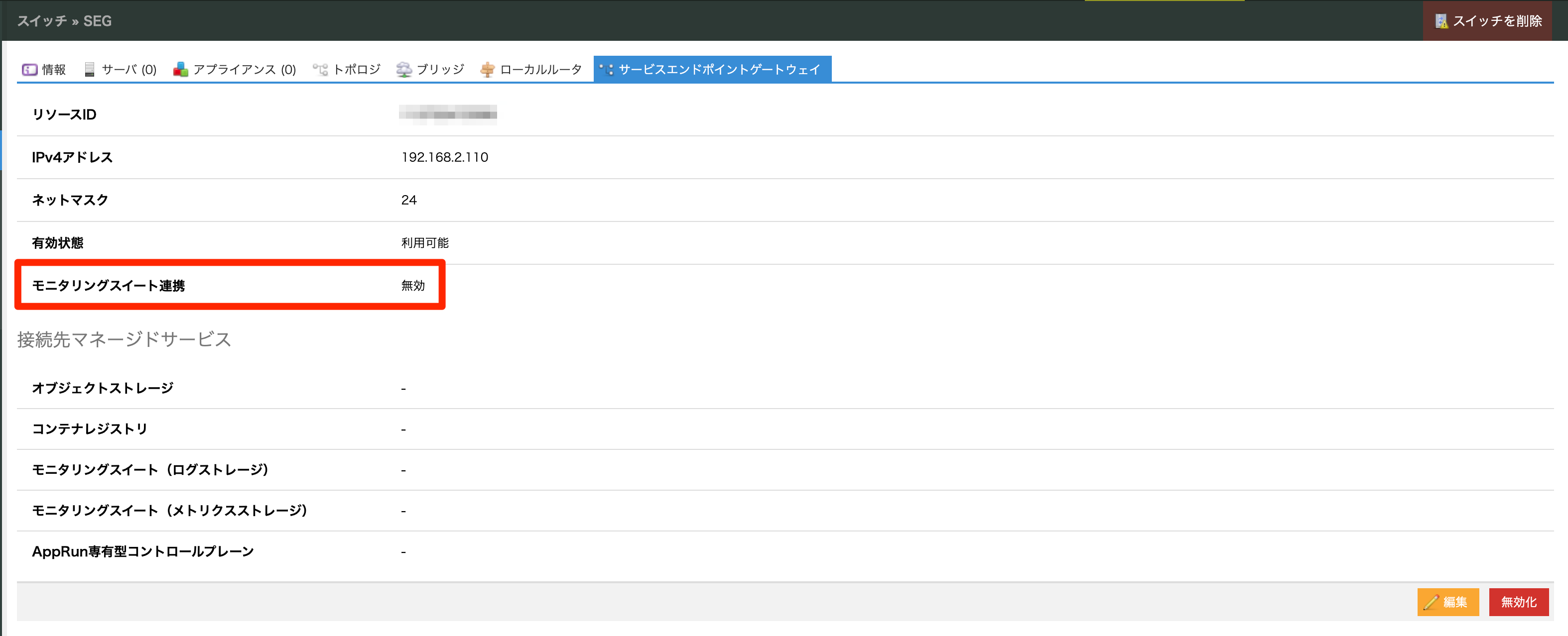 モニタリングスイート連携を有効化したいサービスエンドポイントゲートウェイが有効になっているスイッチをダブルクリックします。