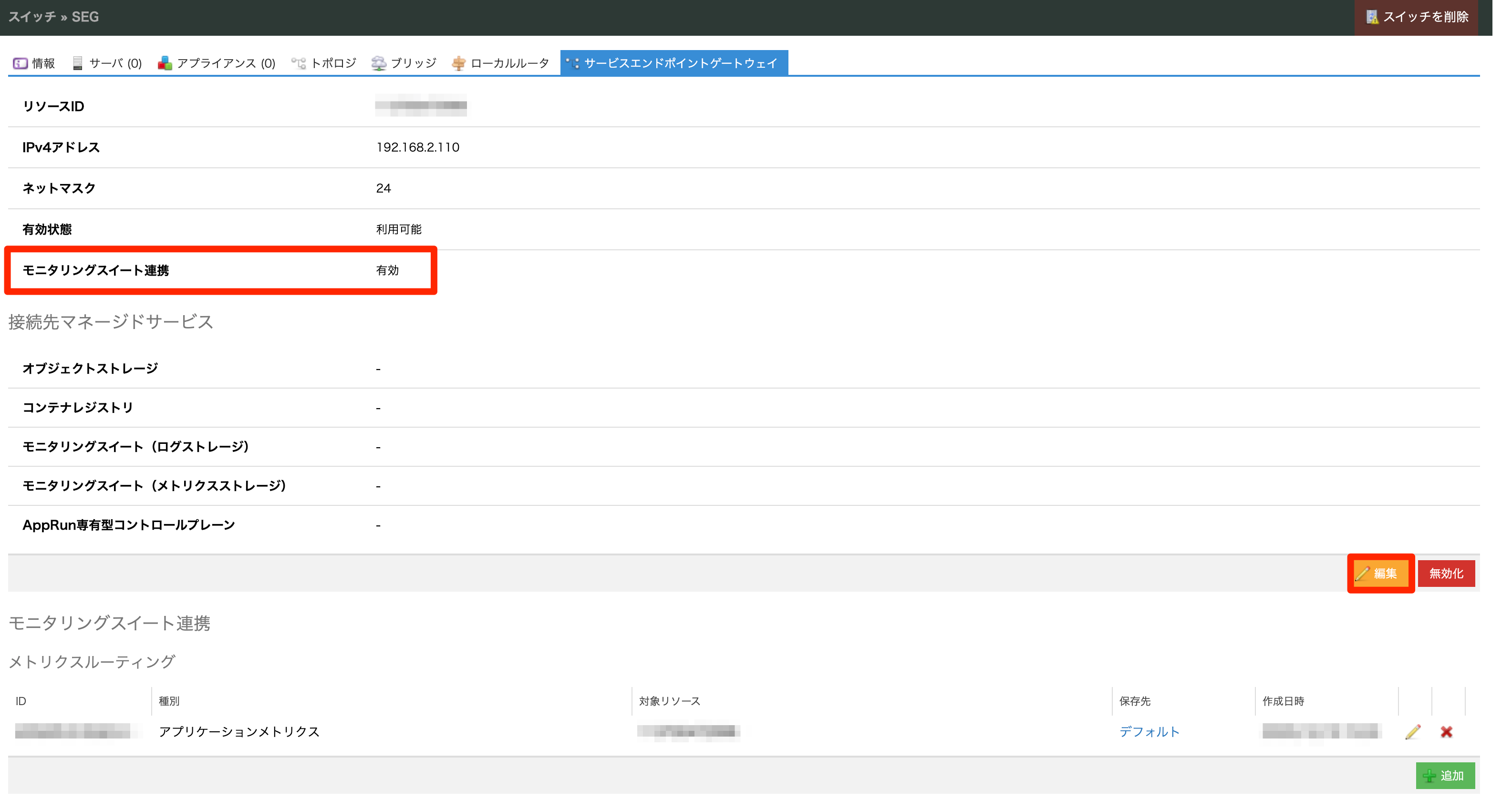 「モニタリングスイート連携」が「有効」になっていることを確認し、「編集」をクリックします。