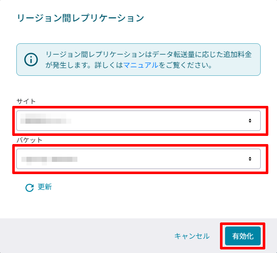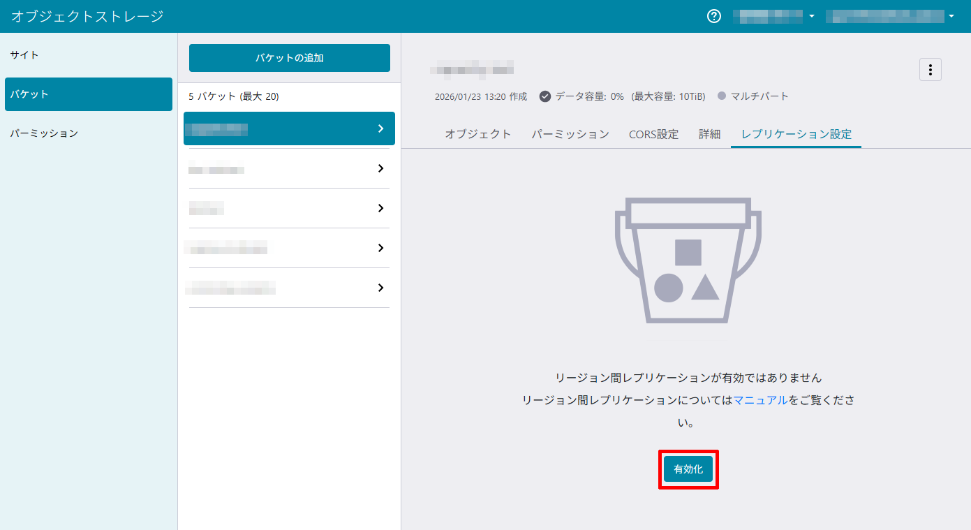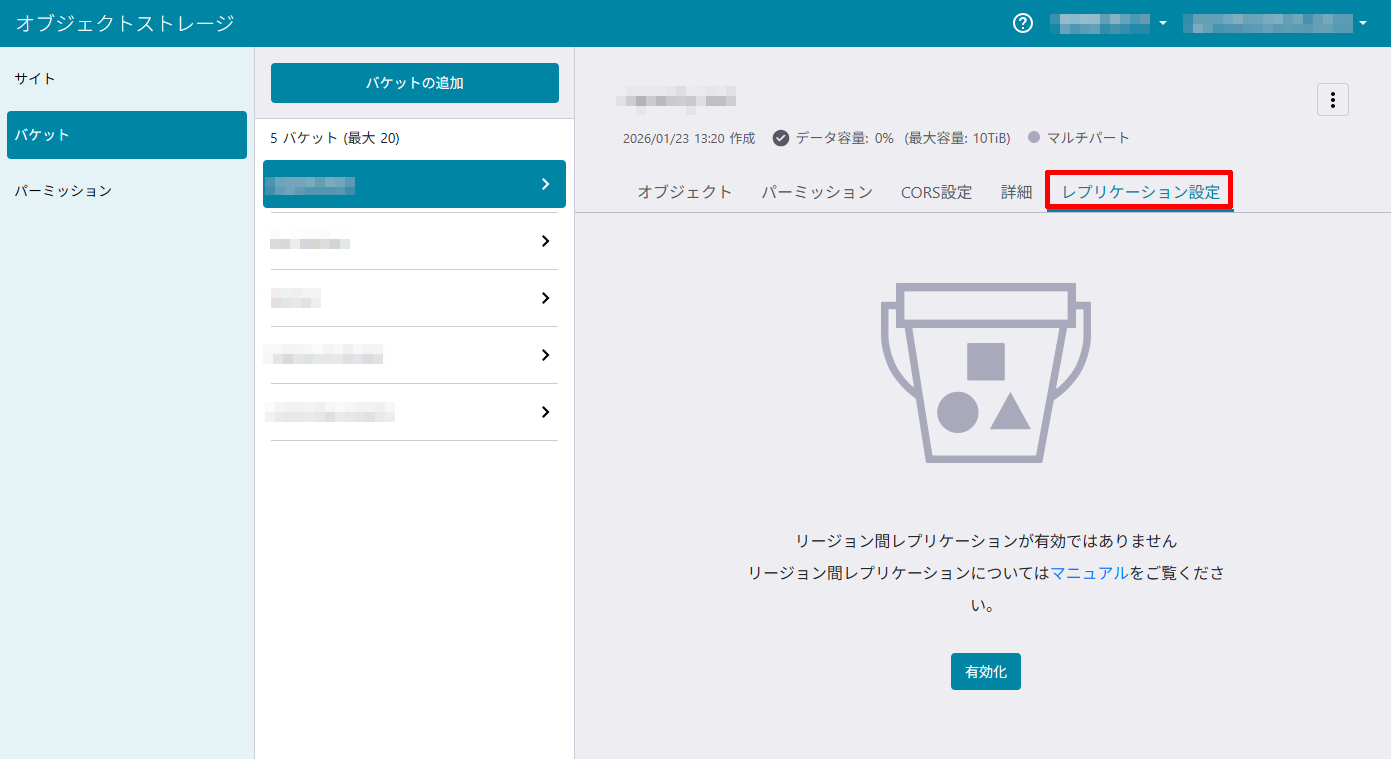 デスティネーションバケットとなるバケットを選択し、「有効化」をクリックします。