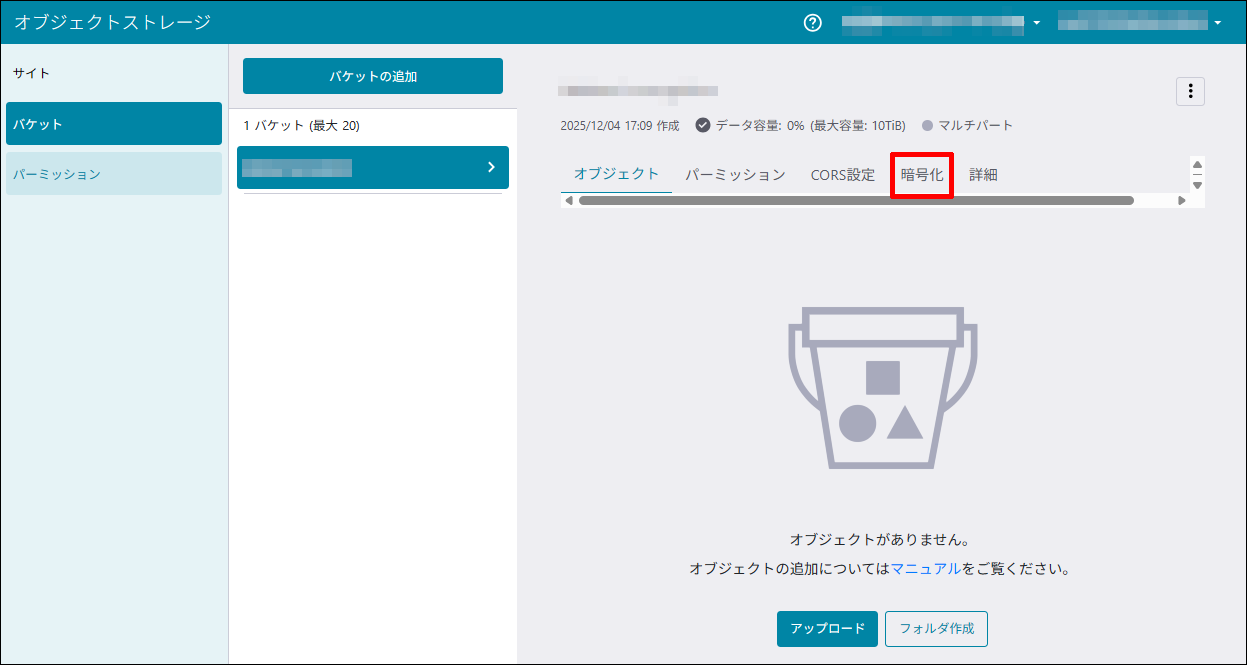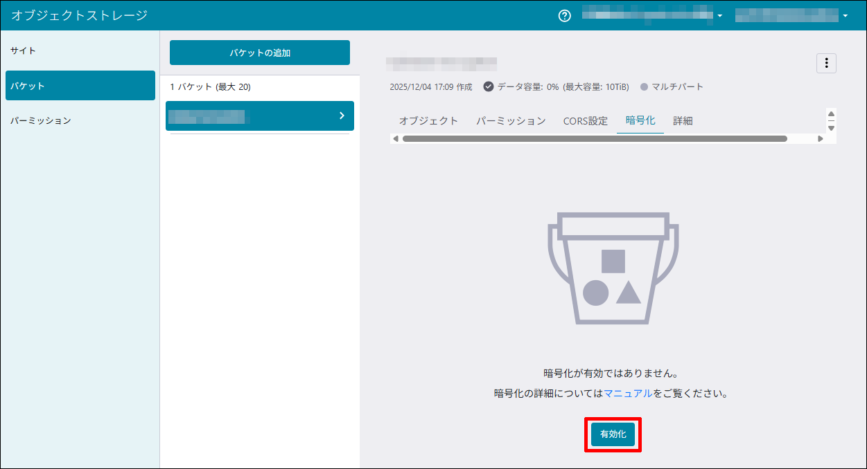 オブジェクトストレージの暗号化設定は コントロールパネル または さくらのオブジェクトストレージAPI で行えます。