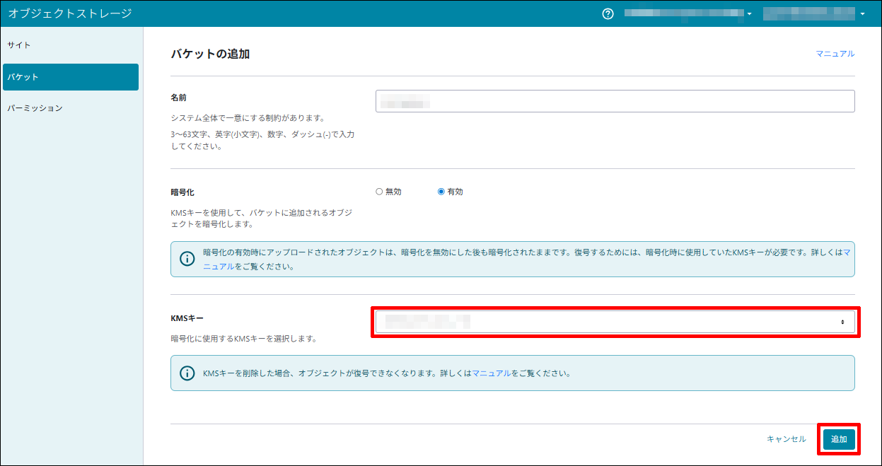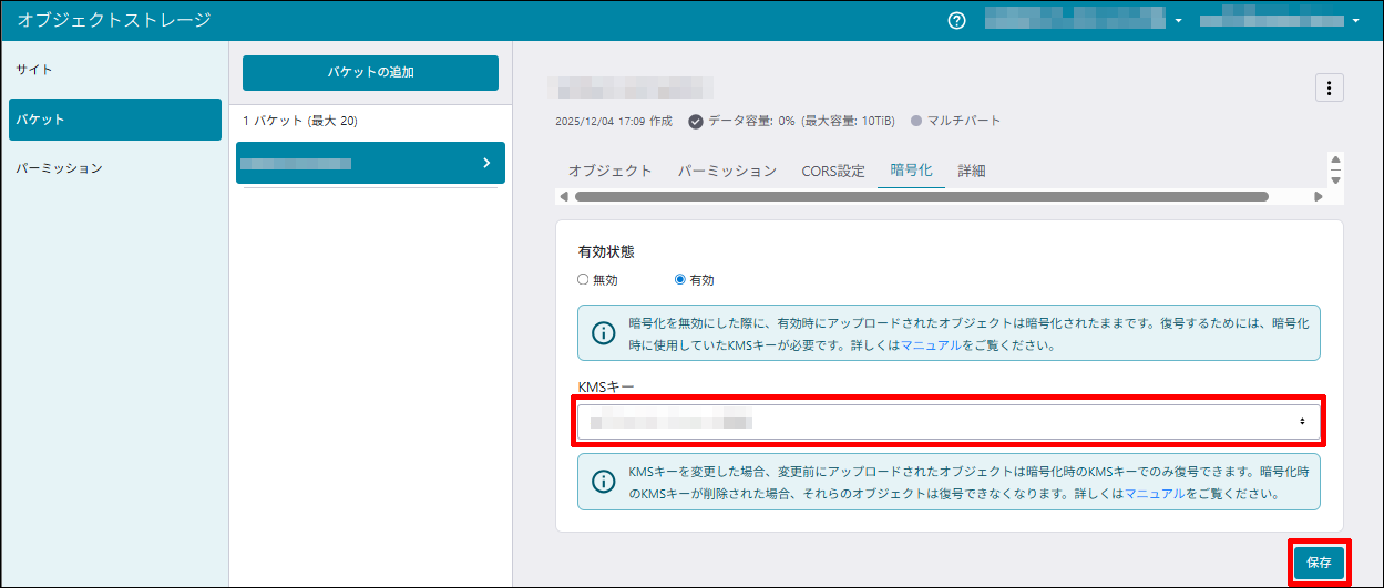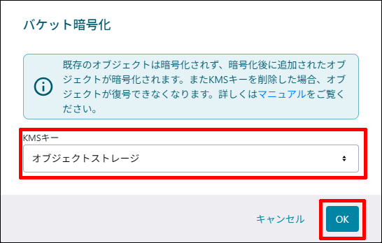 暗号化には KMS(Key Management Service) で事前に作成した KMSキー が必要です。KMSキーの作成方法は KMS(Key Management Service) をご参照ください。