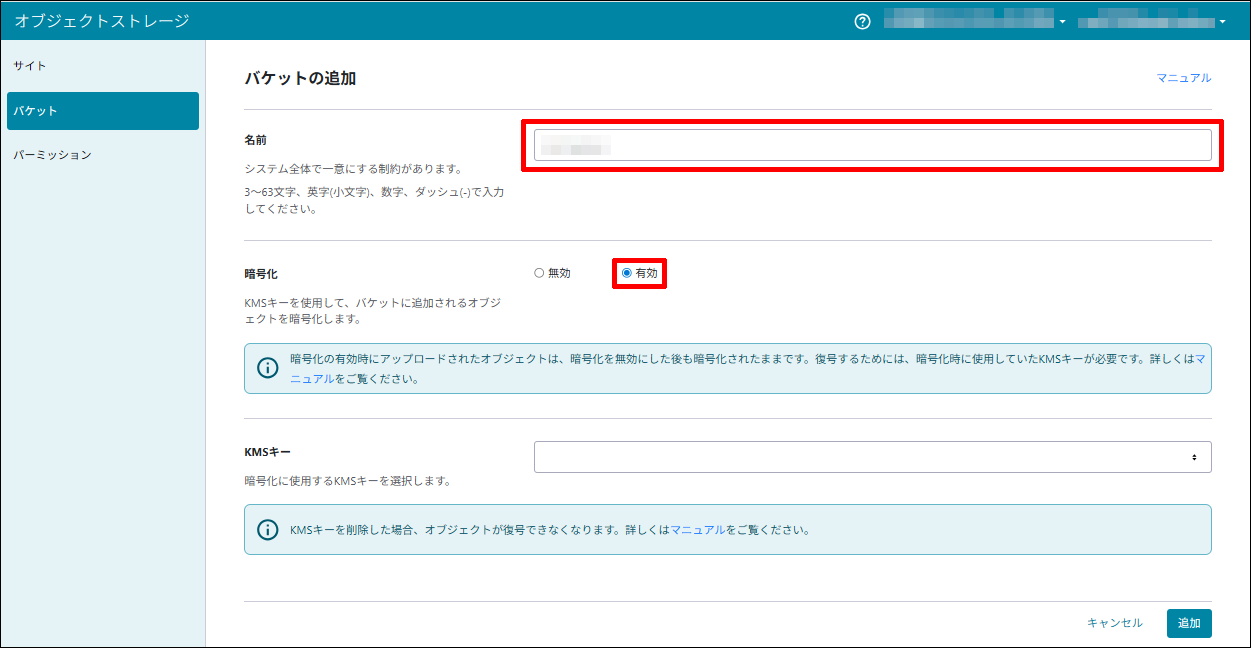 バケットの名前を入力し、暗号化の「有効」をクリックします。