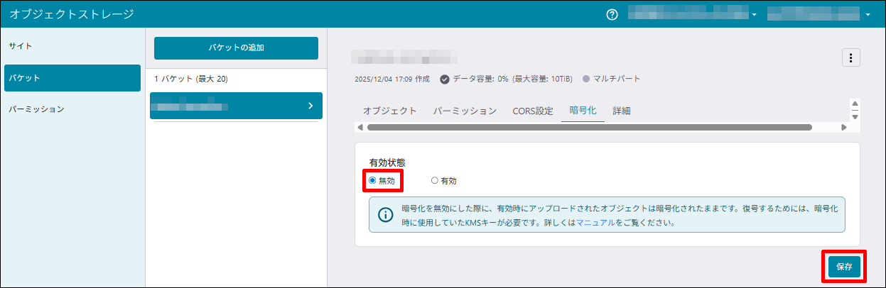 無効化以降にバケットに新しく保存されるオブジェクトが暗号化されずに保存されます。