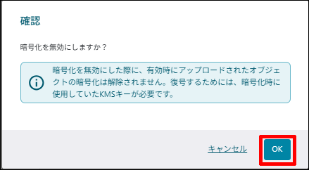 暗号化設定を無効化しても、暗号化済みオブジェクトは暗号化されたまま保存され続けます。