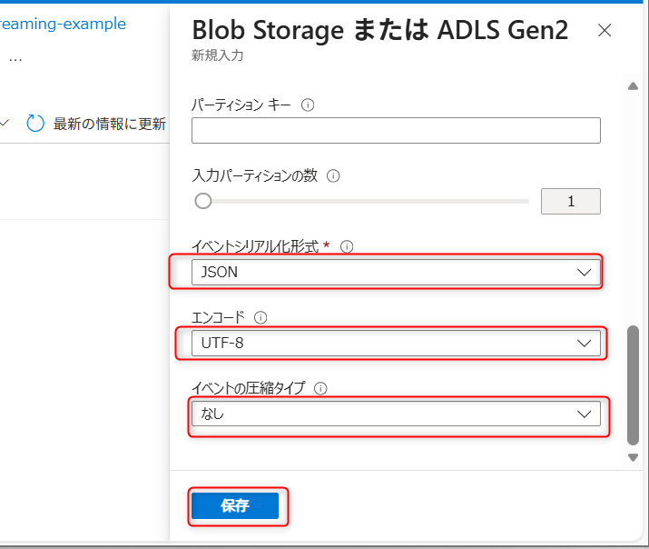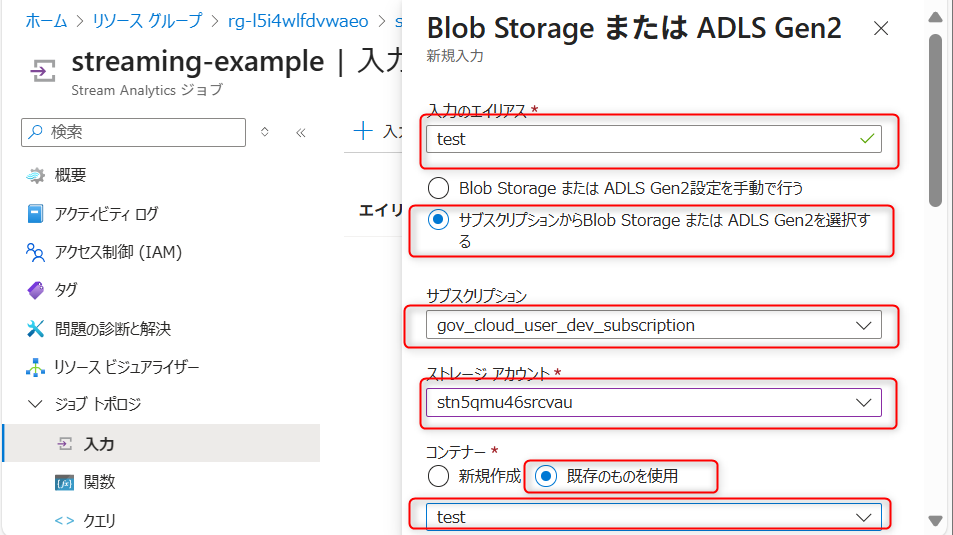 「入力」>「+ ストリーム入力の追加」>「Blob Storage/ADLS Gen2」を選択