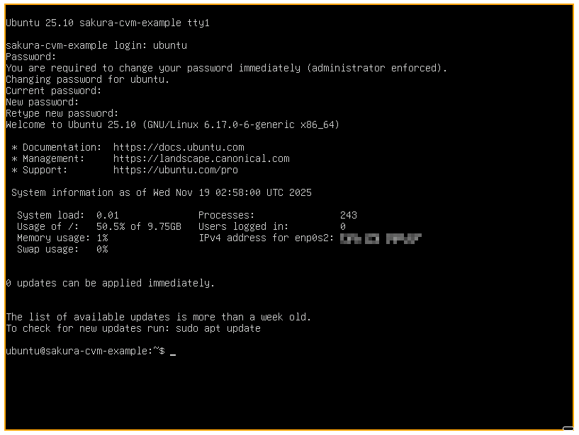 パスワード設定が完了するとシェル画面が表示されます。 /home/ubuntu/.ssh/authorized_keys に公開鍵を追加することで SSH 接続が可能になります。