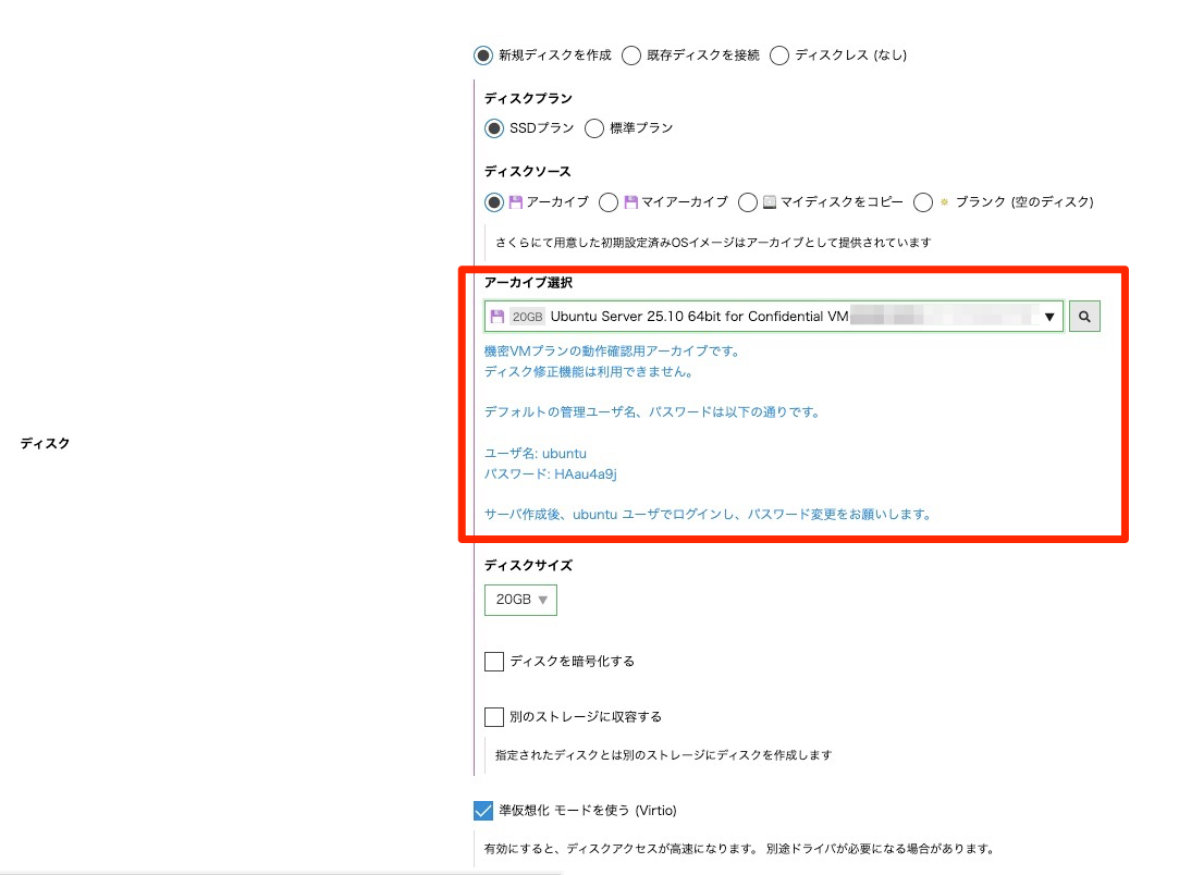 機密 VM 検証用のパブリックアーカイブを指定した状態でサーバ作成を行います。