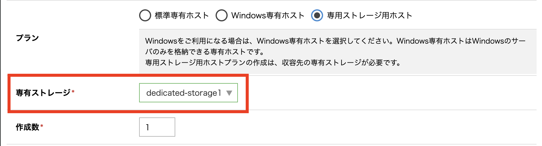 ※専有ストレージ用ホストを選択した際、接続する専有ストレージを指定する必要がございます。専有ストレージの作成方法は 専有ストレージ をご確認ください。