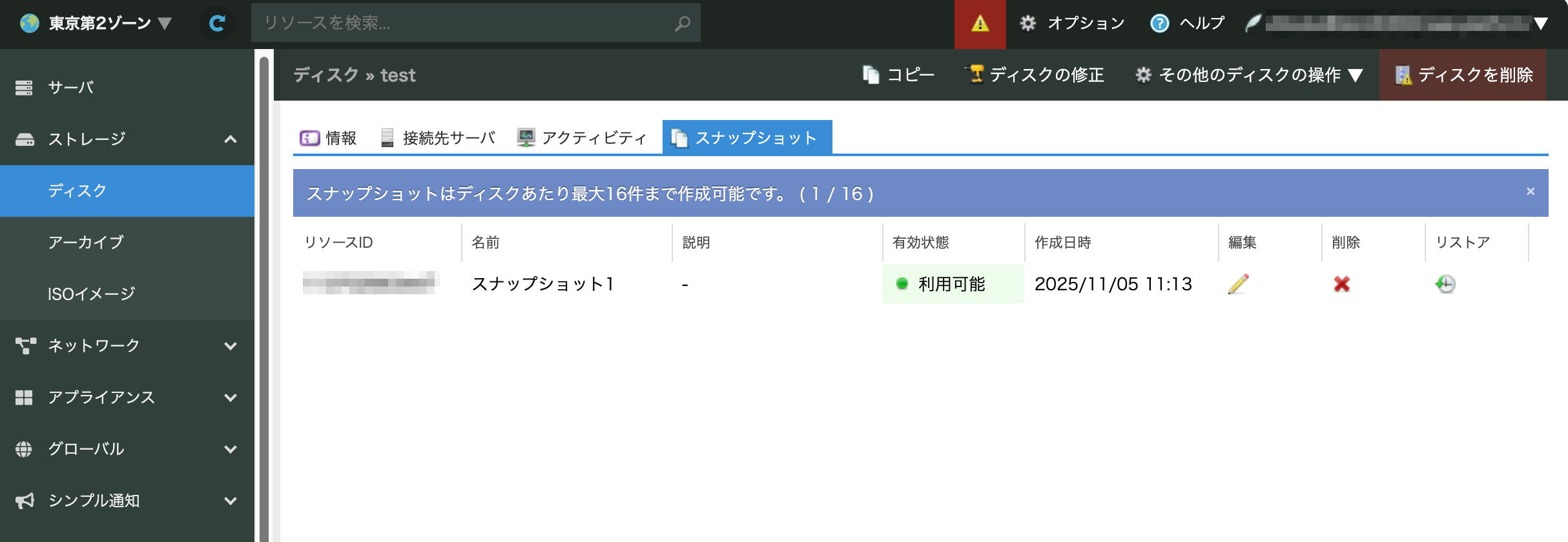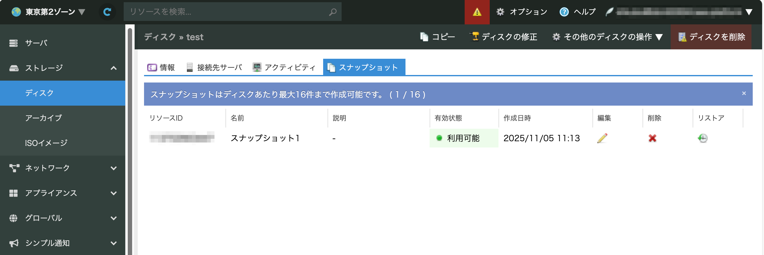 スナップショット機能は、専有ストレージ上に作成されたディスクの状態を任意のタイミングで保存できるバックアップ機能です。 保存されたスナップショットは、取得したディスクに復元可能で、障害復旧や過去時点へのロールバックを行うことができます。