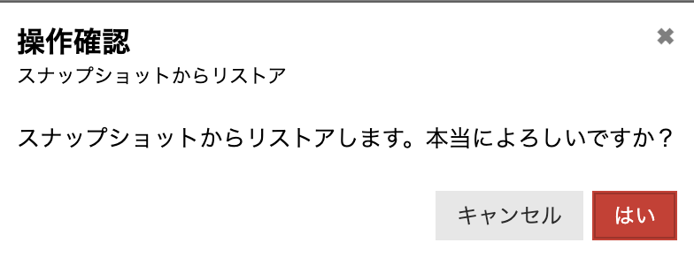 「スナップショット」タブから復元元のスナップショットの「リストア」アイコンを押下します。