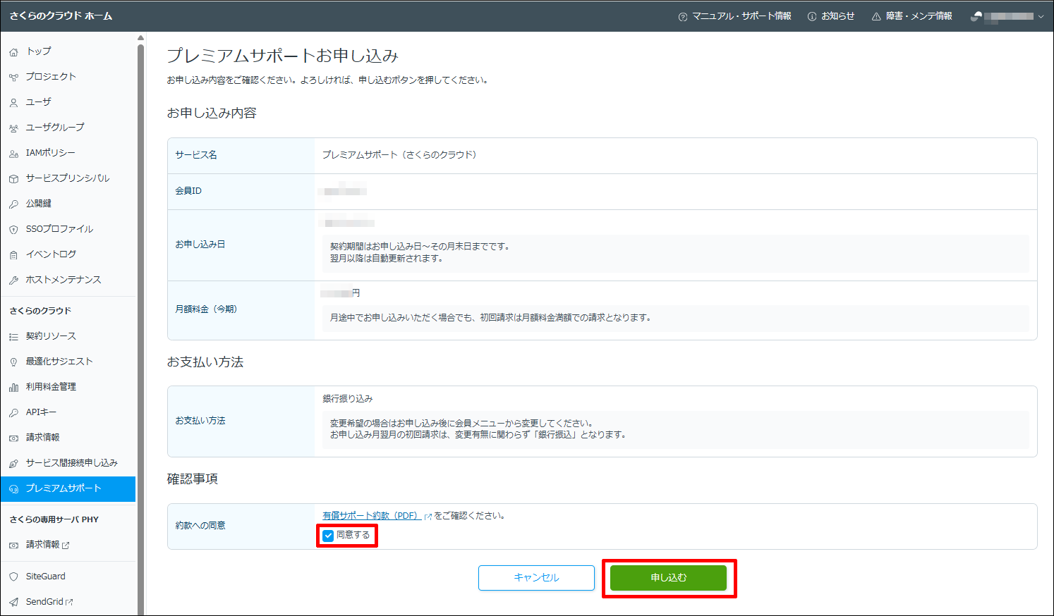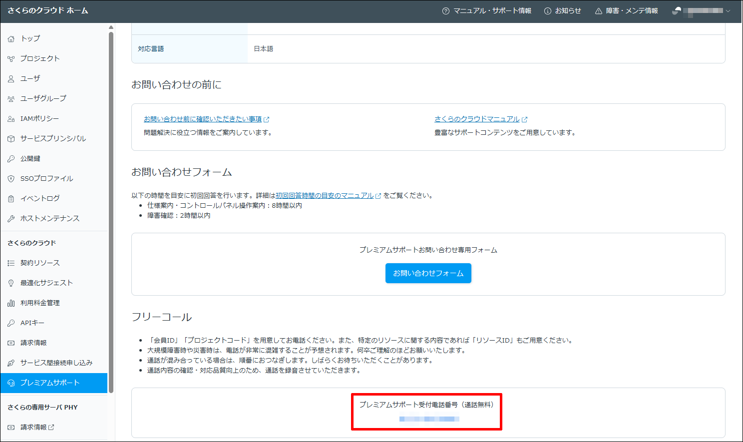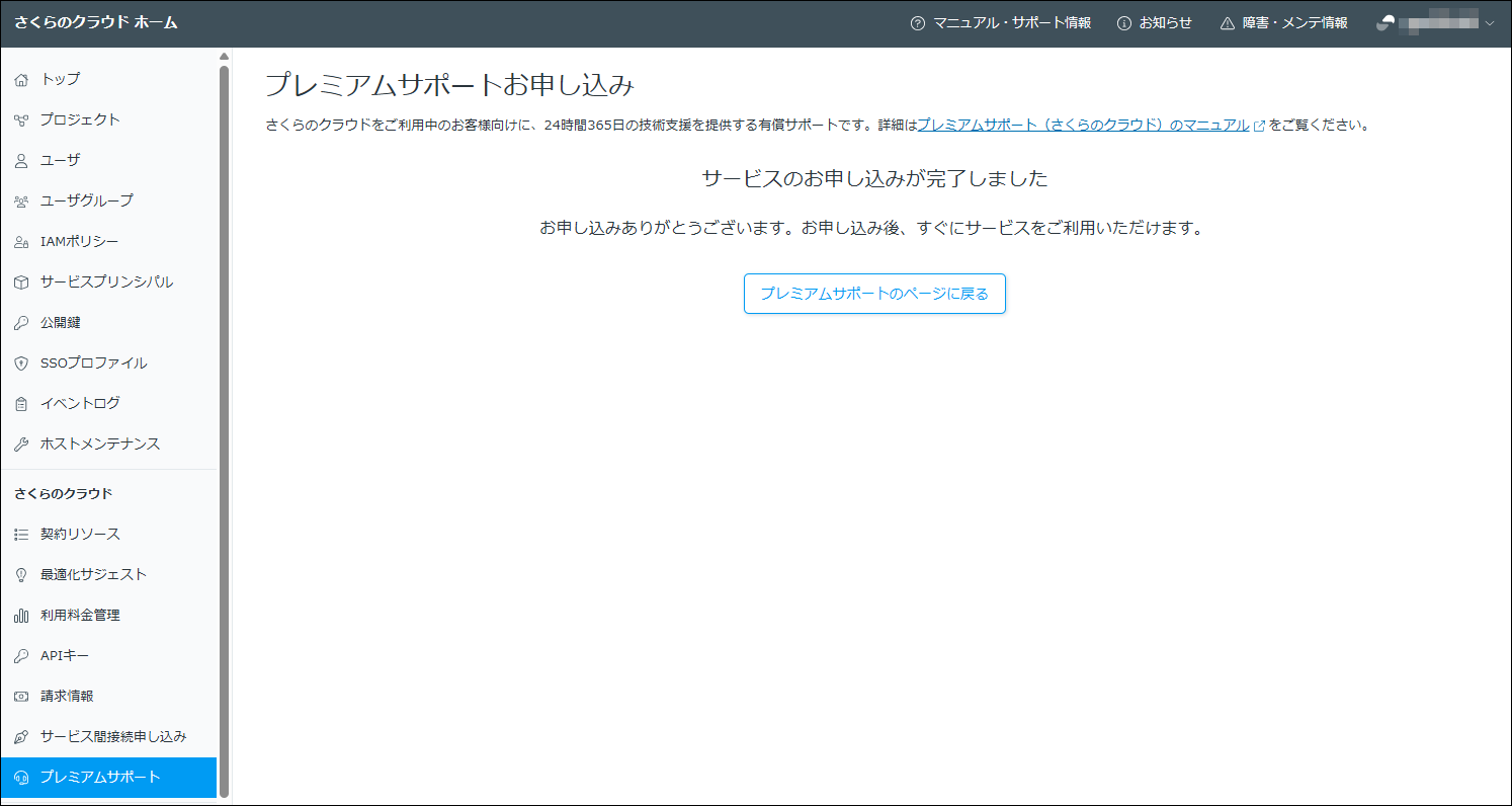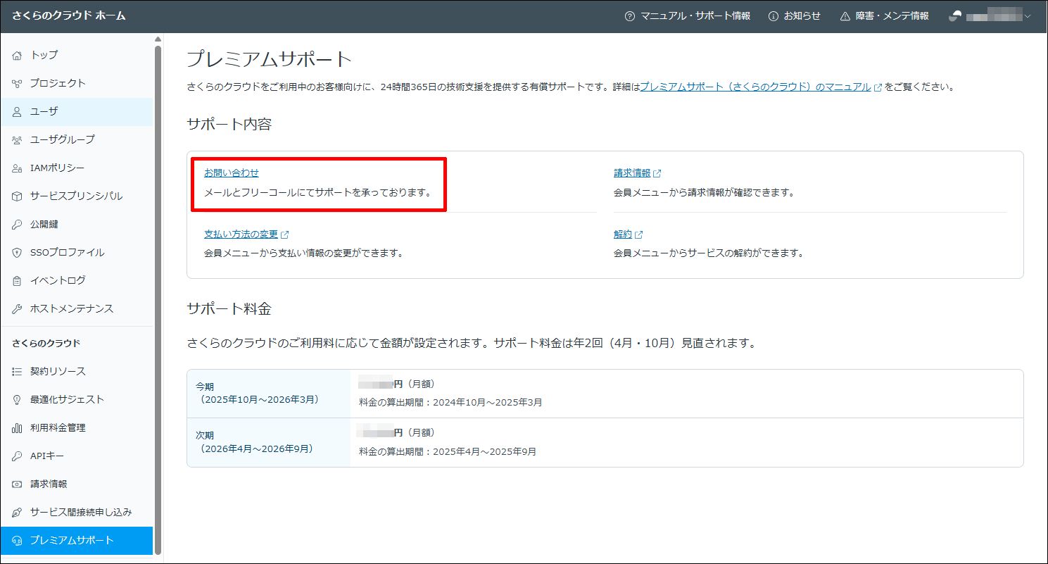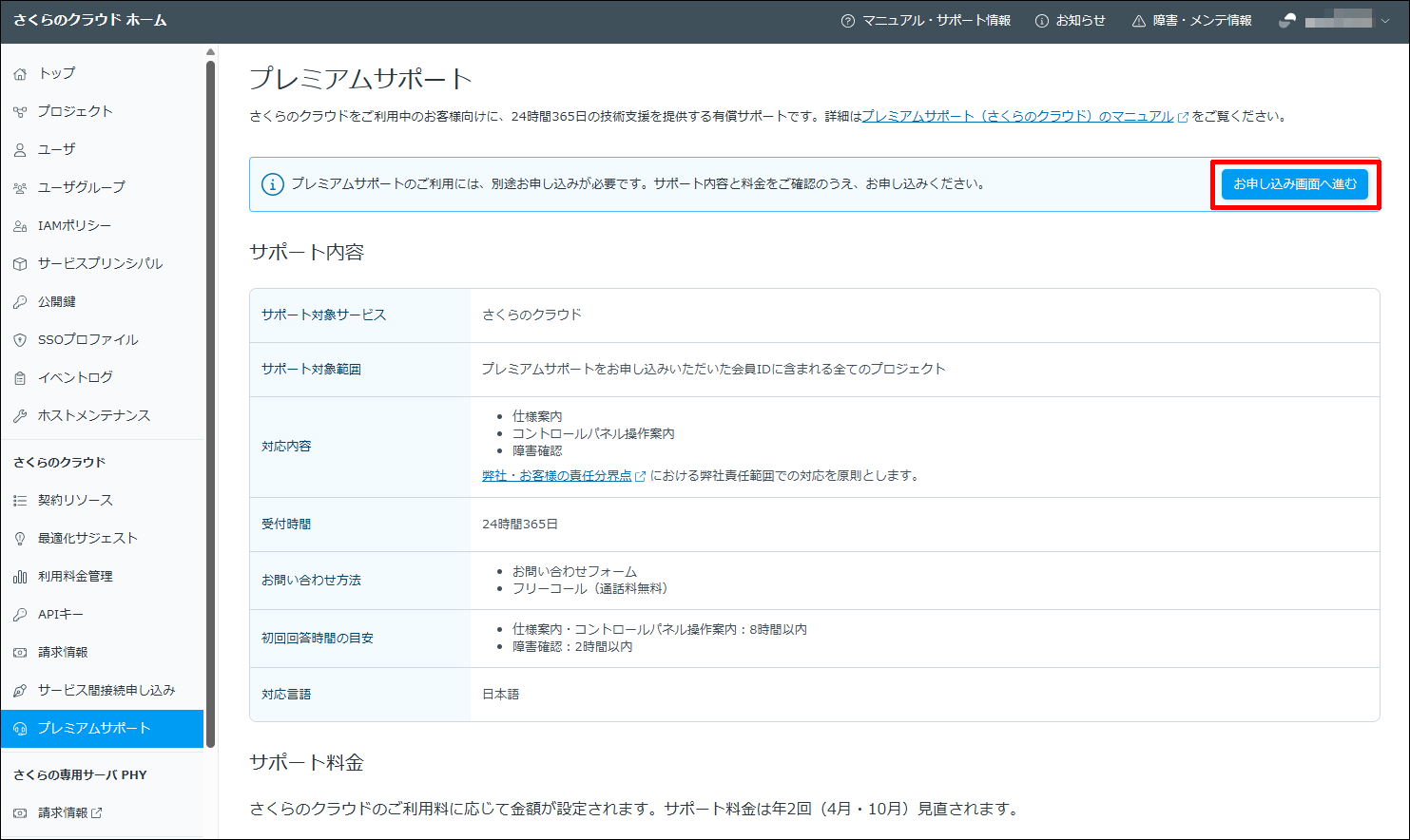 さくらのクラウドホーム画面の左メニューから「プレミアムサポート」をクリックします。