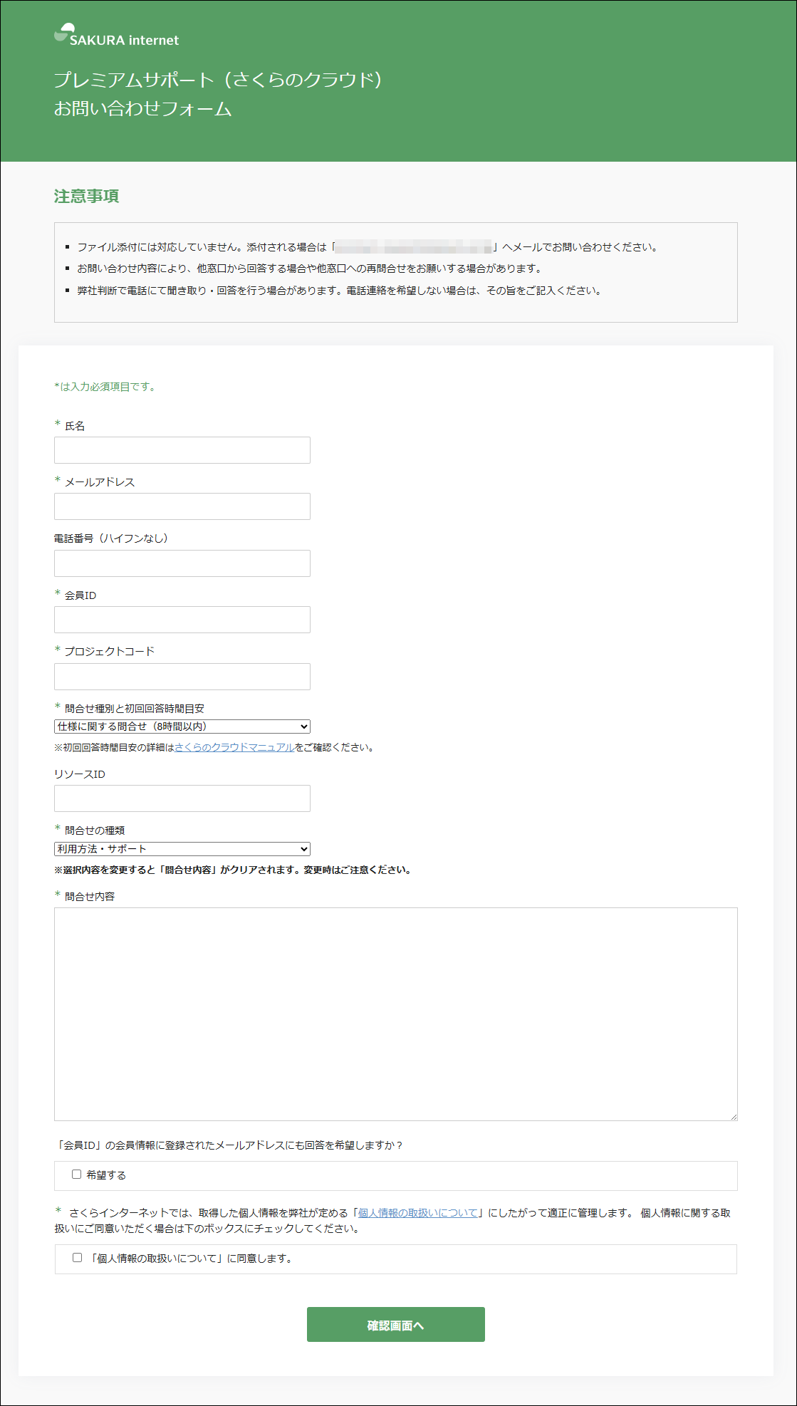 フォームの各項目を入力し、「確認画面へ」ボタンをクリックします。