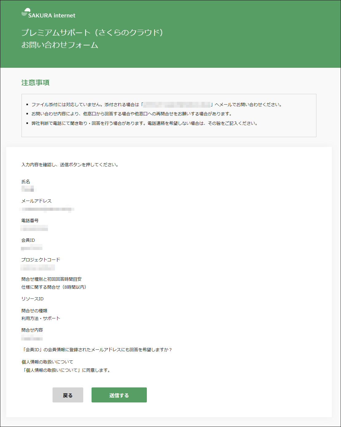 お問い合わせ内容を確認し、「送信する」ボタンをクリックします。