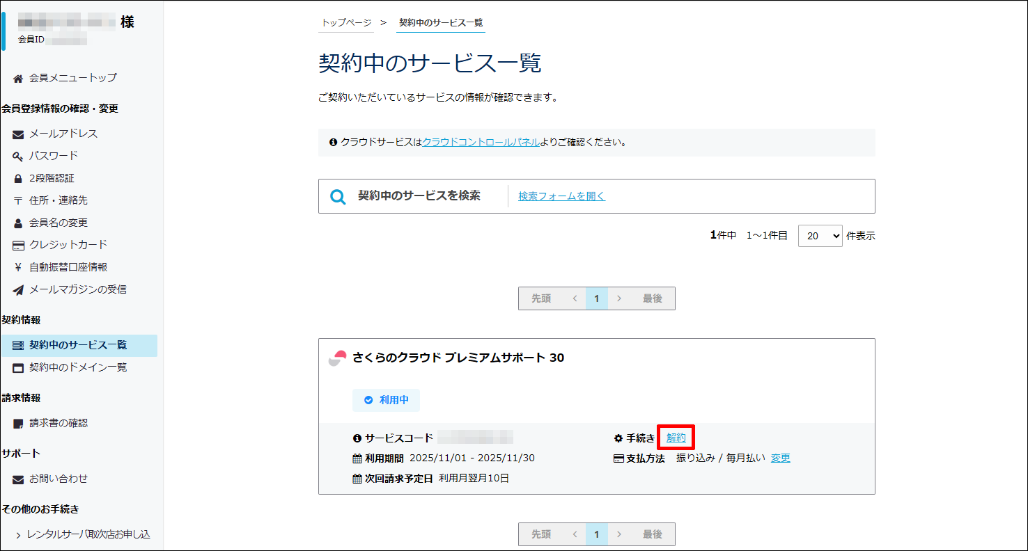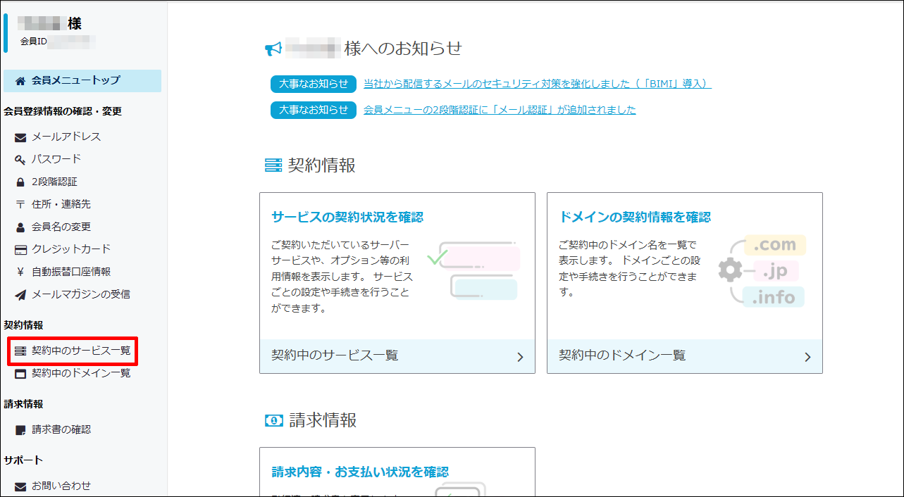 会員メニュー画面の左メニューから「契約中のサービス一覧」をクリックします。