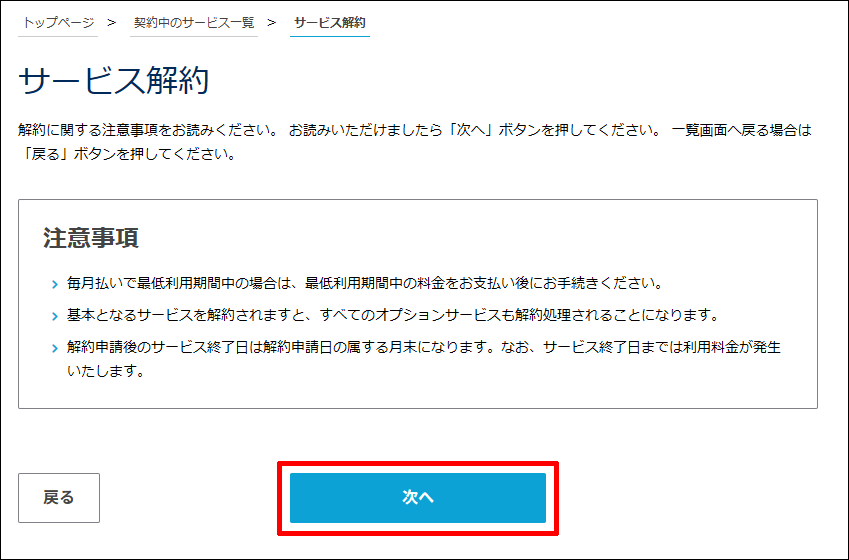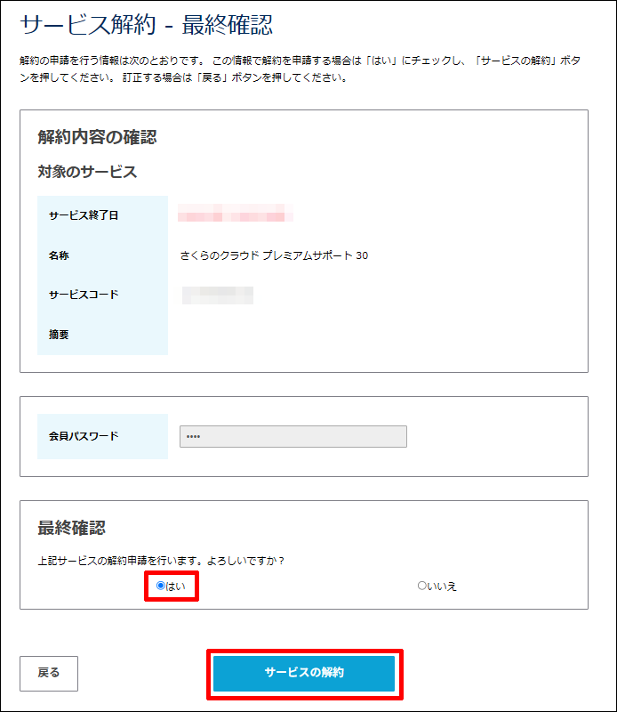 解約するサービス内容を確認し、「はい」にチェックを入れ、「サービスの解約」をクリックします。