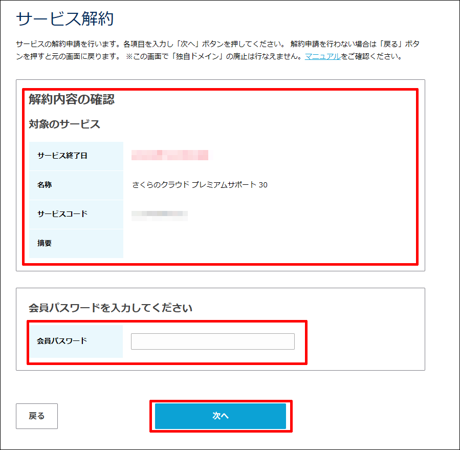 解約されるサービス情報を確認、会員パスワードを入力し「次へ」をクリックします。