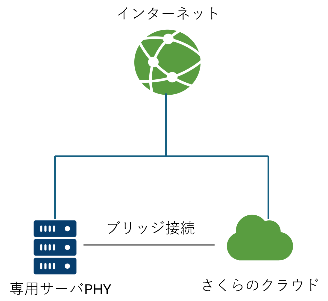 高いネットワーク要件が必要なサーバのみ専用サーバPHYに配置し、その他のサーバはさくらのクラウドに配置するハイブリッド構成も可能です。専用サーバPHYとさくらのクラウドは、ブリッジ接続により同一L2ネットワークとして構成できます。
