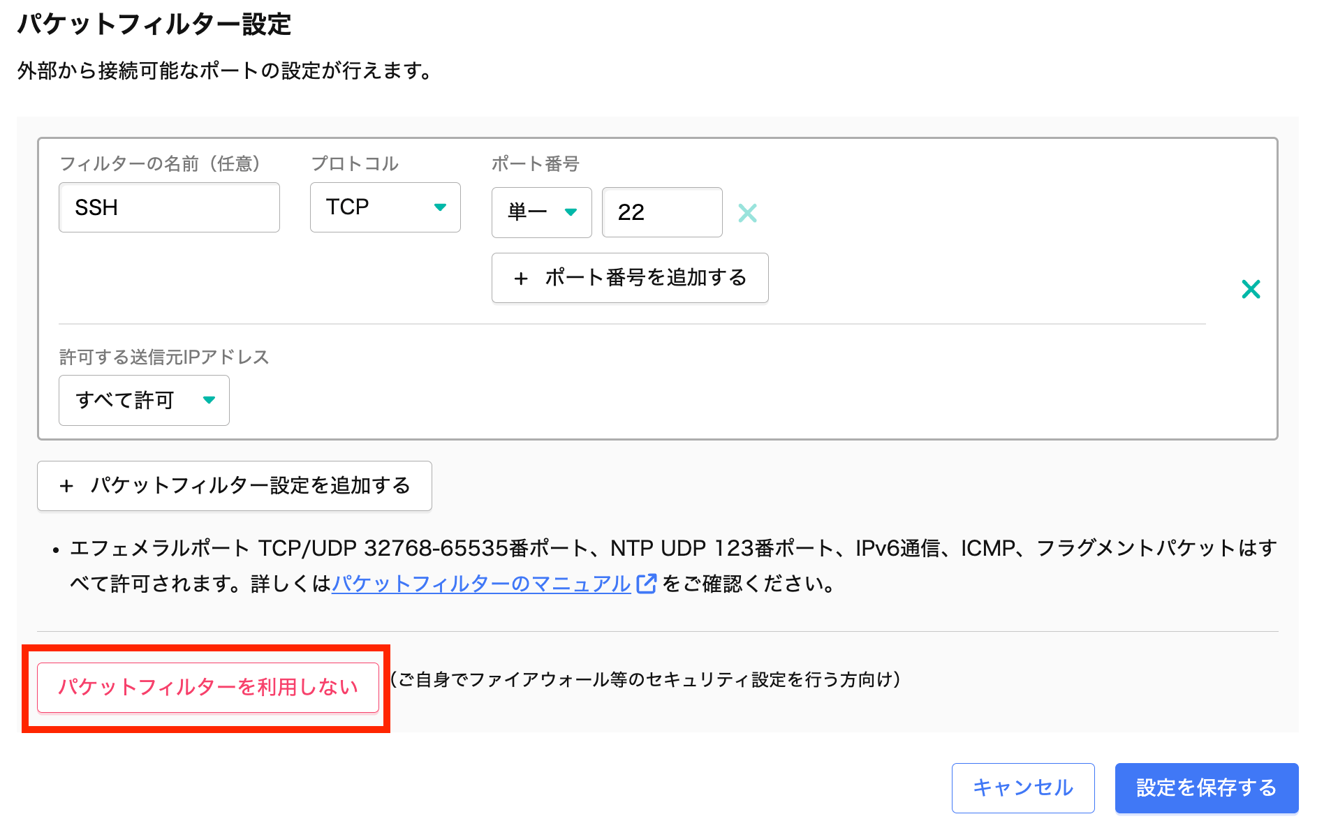 ご自身のサーバー内でファイアウォール設定を行っている場合は、設定が重複する恐れがあるため「パケットフィルターを利用しない」を推奨いたします。